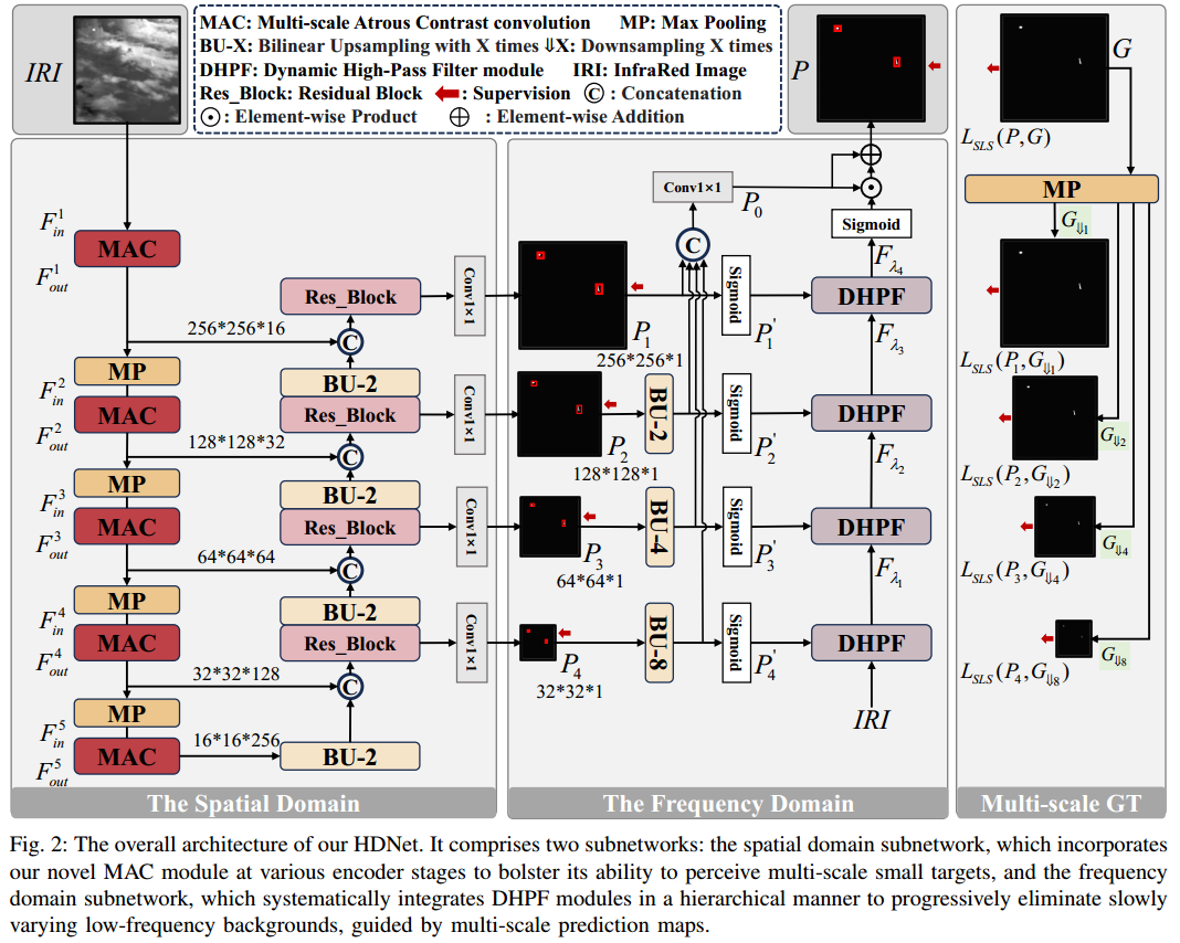本文提出了一个混合域网络(HDNet),旨在结合空间域的多尺度感知能力与频率域的背景抑制能力,以解决红外小目标检测中目标尺寸多变及背景干扰严重的问题 。为实现这一目标,作者设计了两个核心模块:其一是位于空间域的多尺度空洞对比度卷积(MAC)模块,通过利用多个不同核尺寸的并行空洞对比度卷积,增强了网络对尺寸微小且多变目标的感知能力并提升了目标与背景的对比度 ;其二是位于频率域的动态高通滤波器(DHPF)模块,该模块通过分层计算低频信号能量并根据图像内容动态剔除特定比例的低频成分,有效保留了图像的高频细节并抑制了缓慢变化的背景干扰 。此外,该网络将空间域与频率域的特征进行融合,并在三个公开数据集上对比26种先进方法验证了其有效性 。