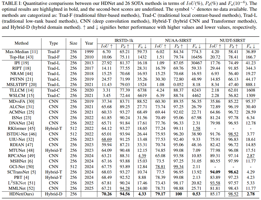 HDNet 提出了一种创新的混合域网络架构,通过协同利用空间域的多尺度空洞对比卷积(MAC)与频率域的动态高通滤波器(DHPF),实现了对可变尺寸微小目标的精准感知及低频背景干扰的自适应抑制 。该方法有效解决了红外图像信噪比低的难题,在三个主流数据集上对比 26 种先进方法均取得了 SOTA 性能,同时保持了优异的计算效率 。