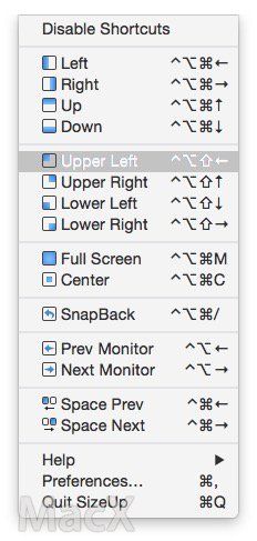 在SizeUp 的菜单栏选择窗口操作命令后,可以实现与快捷键相同的效果。SizeUp 是一款非常实用的窗口管理软件,对于需要同时打开多个应用窗口的用户来说,SizeUp 很实用。