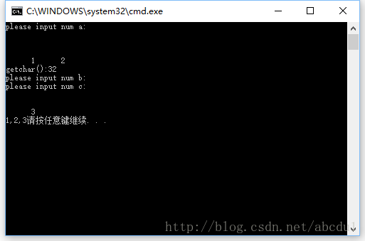 在前两个scanf()之间加入了getchar(),获取的值是32,及空格的ASCII码,所以它获取的是”1“和”2“之间输入的空格,而”1“之前的回车键没有获取到,说明被第一个scanf()函数已经从stdin缓冲区取走,或者理解为指针已经指向”1“之后的地址。