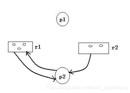 第四步:再看进程P1,它只申请一个R2资源,此时,系统还剩余一个R2资源没分配,因此,可以满足P1的申请。这样,进程P1便得到了它的全部所需资源,所以它不会进入阻塞状态,可以一直运行,等它运行完后,我们再把它的所有的资源释放。相当于:可以把P1的所有的边去掉,变成一个孤立的点,如下图所示:
