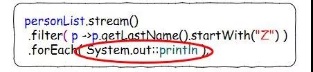 对比最开始的Lambda写法,这里已经非常非常简洁了。但是如果,我们要求变一下,变成print这个人的全部信息,及p -> System.out.println§; 那么还可以利用Method reference来继续简化。所谓Method reference, 就是用已经写好的别的Object/Class的method来代替Lambda expression。格式如下: