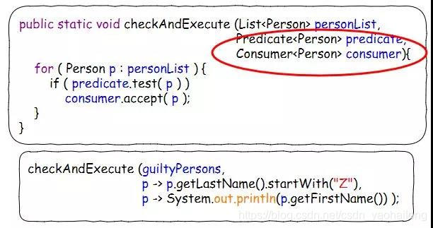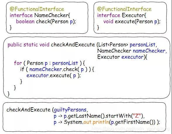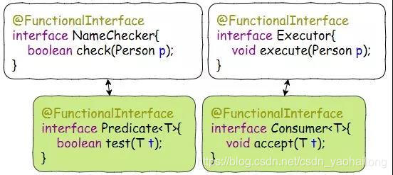 所以,我们在这里压根都不需要定义NameChecker和Executor这两个函数式接口,直接用Java 8函数式接口包里的Predicate和Consumer就可以了——因为他们这一对的接口定义和NameChecker/Executor其实是一样的。