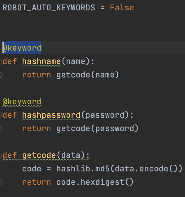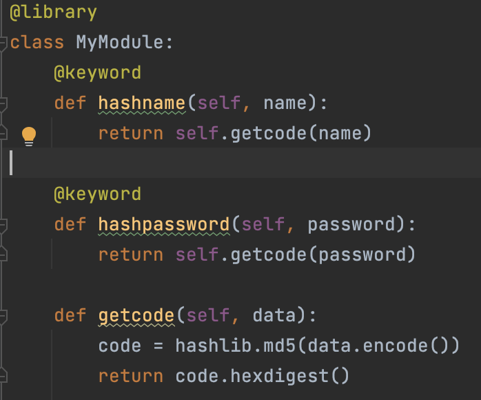 import hashlib from robot.libraries.BuiltIn import BuiltIn class MyModule: def getcode(self,password): code = hashlib.md5(BuiltIn().replace_variables("${password}").encode()) print(code.hexdigest())