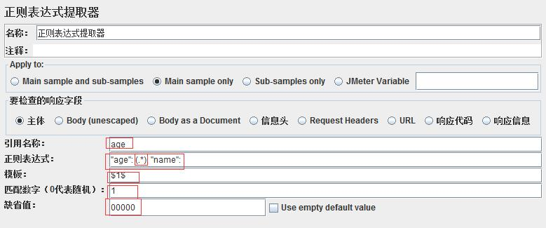 在正则表达式提取器中填写 引用名称,不说也知道用途;正则表达式,最简单的办法是在响应数据中把要提取的目标值左右若干字符包含目标值的一行拷贝出来,粘贴到正则表达式框内,在把目标值用一对小括号替换,括号里用添上合适的匹配符本例如(.*); 注意在响应数据中拷贝时尽量避开需要转义的字符如果不能避开,请转义;模板通常固定填$1$;匹配数字1代表区匹配的第一个值;缺省值是在匹配失败时取得的值,通常用来检查匹配是否成功;