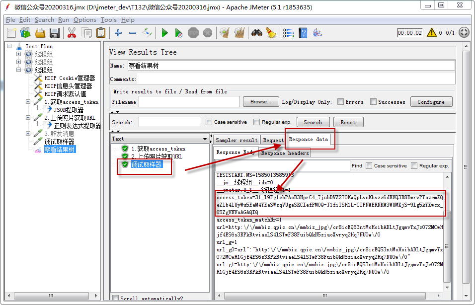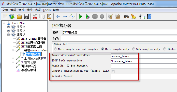 Name of created varialies:即下一个请求要引用的参数名称,如填写access_token,则可用${ access_token}引用它。