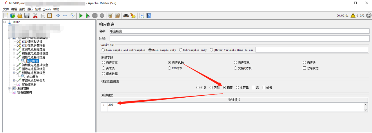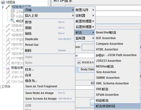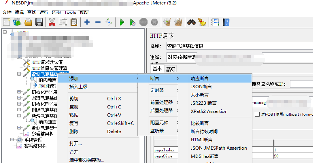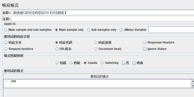 右键添加→断言→响应断言,在应用场景中的断言包括状态断言和业务断言,状态断言主要用于检测响应的状态是否和预期一致,业务断言测试请求或者响应中返回值是否满足业务需求。