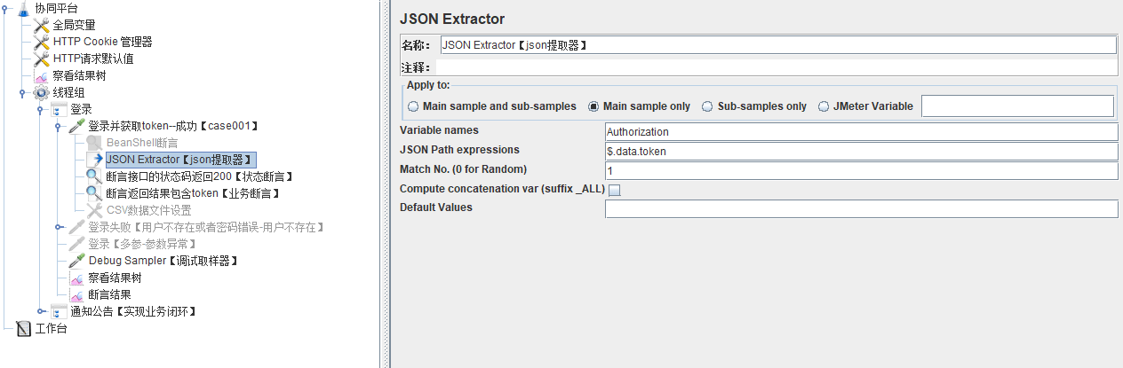 在HTTP请求(登陆请求)右键→后置处理器→Json提取器:这个主要用来提取请求返回结果中需要的数据,下图中设置的就是获取登录的返回值中的token,后并设置变量名为“Authorization”,后面测试别的接口的时候需要调用这个值。