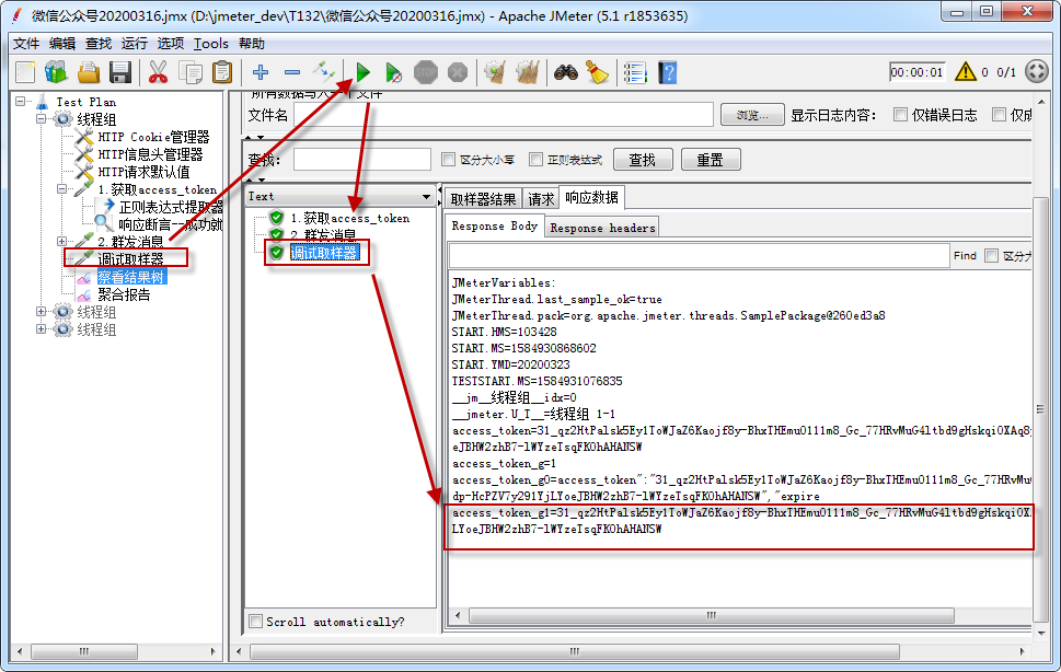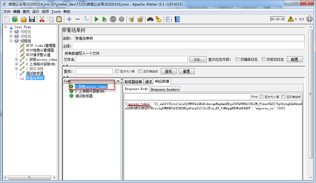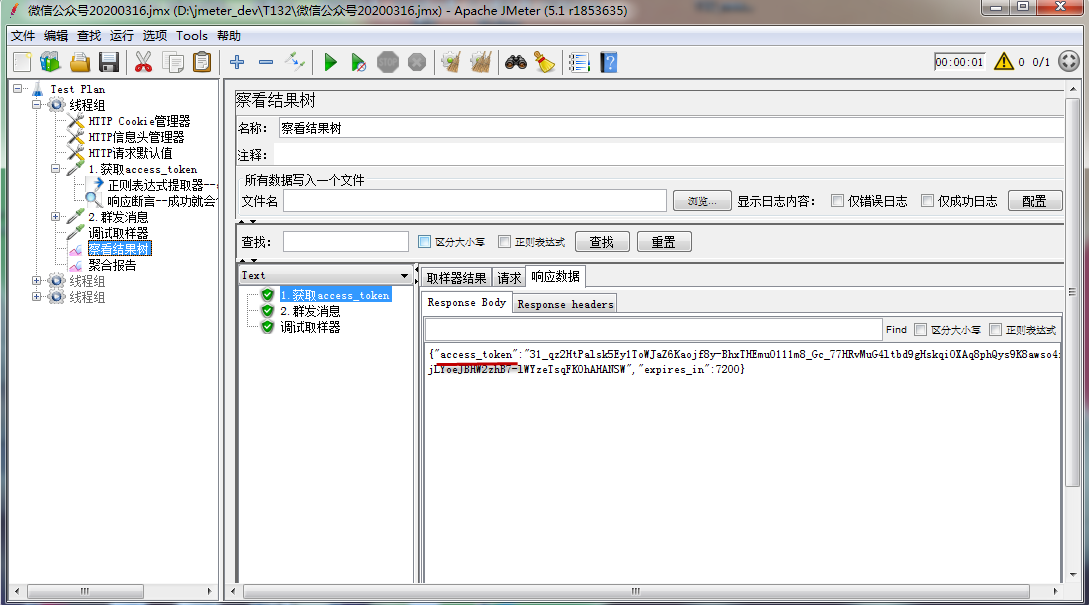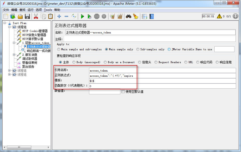 1、在需要获得数据的请求“1.获取access_token” 上右击添加一个后置处理器-->正则表达式提取器