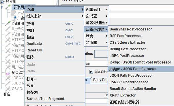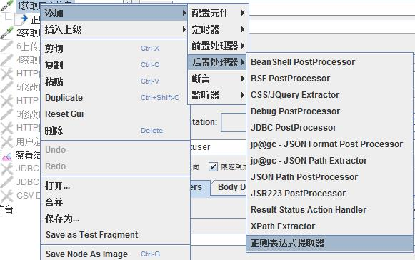 在需要被提取响应数据的请求下添加正则表达式提取器,右击添加->后置处理器->正则表达式提取器;