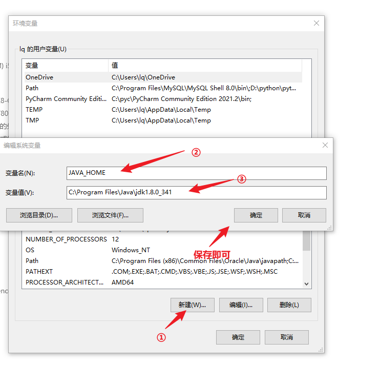 1、在环境变量中新建一个系统变量,变量名为JAVA_HOME,变量值:C:\Program Files\Java\jdk1.8.0_341,该地址为自己本地安装JDK的路径。