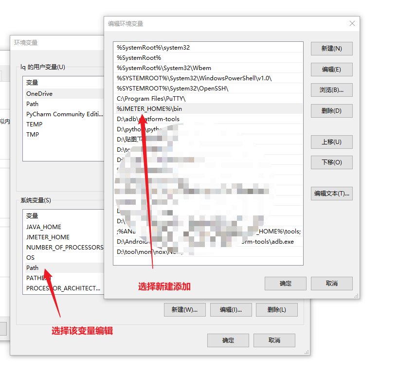 3、在系统变量Path 中新建一个,将%JMETER_HOME%\bin添加在里面,然后保存即可。