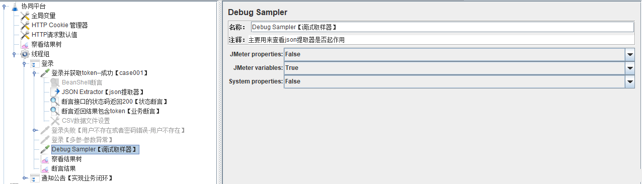 需要验证Json提取器是否起作用,可以通过右键添加取样器Debug Sampler,这样查看结果树中就会展示提取器中获取详细信息。
