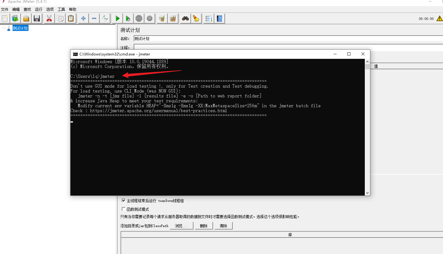 4、验证JMeter的环境变量是否配置成功,打开cmd命令窗口输入jmeter ,回车可打开jmeter即可。