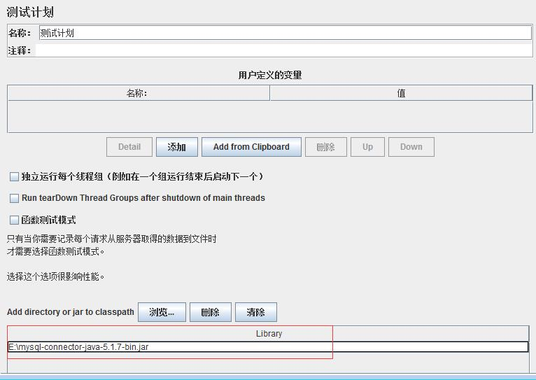 测试计划添加.jar包 mysql-connector-java-5.1.7-bin.jar用于使Jmeter可以读取Mysql;