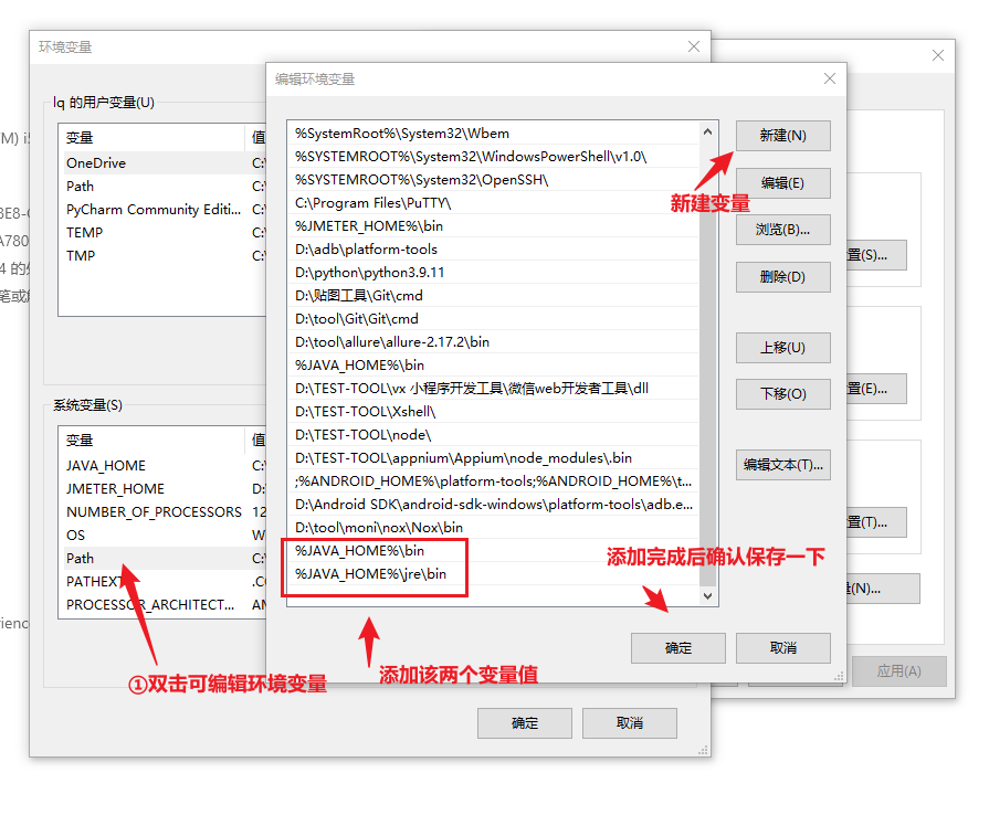 3、在系统变量Path中新增俩个变量值,分别是%JAVA_HOME%\bin 和 %JAVA_HOME%\jre\bin