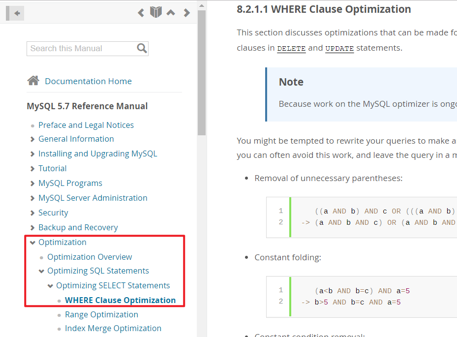 8.2.1.1 WHERE Clause Optimization中是针对where子句优化的官方资料,其中提到这么一段: