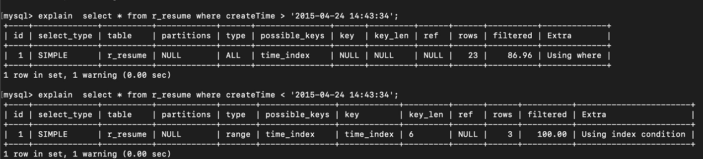 mysql> explain select * from test_user where create_time < '2007-07-02 13:07:51';