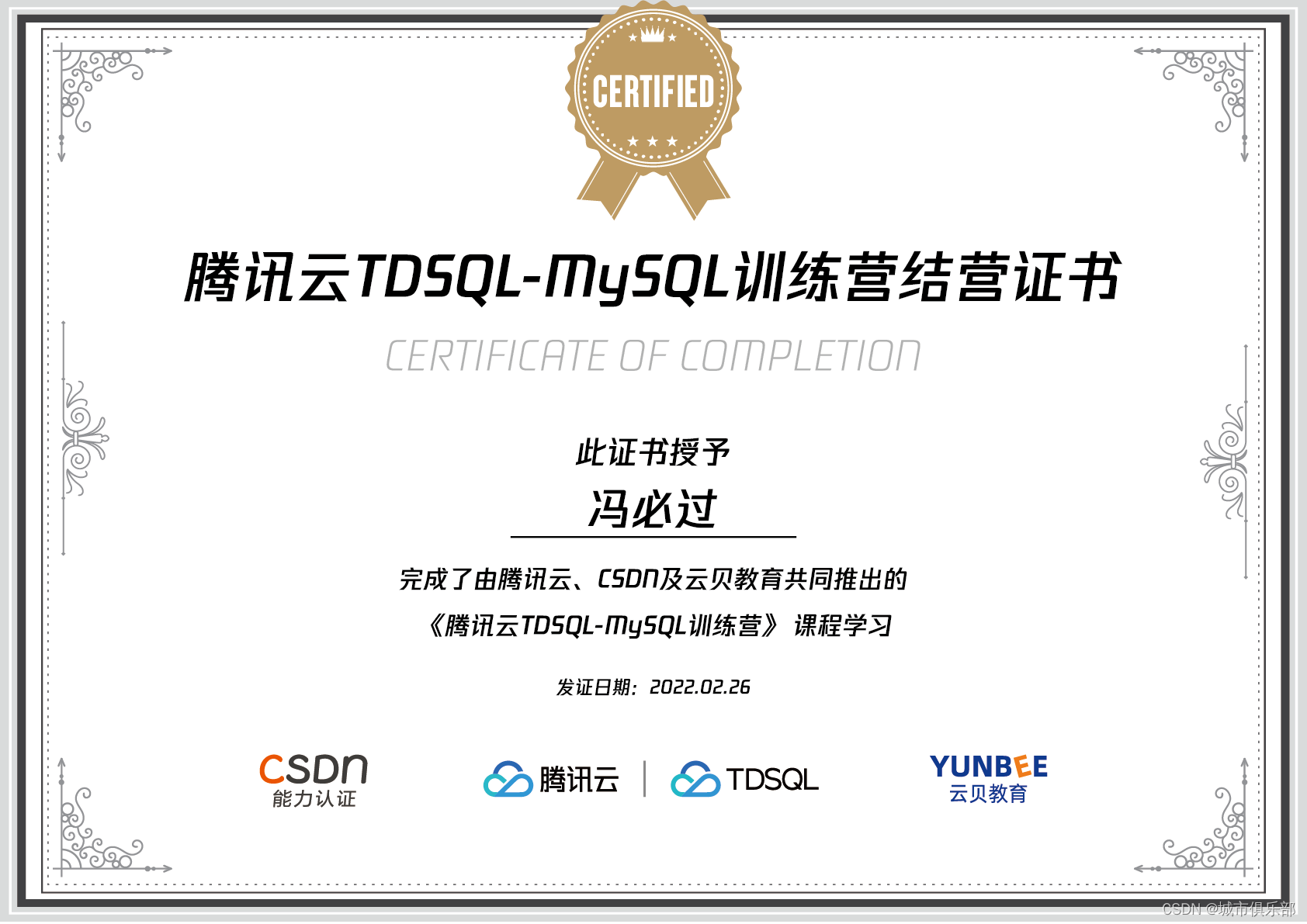 完成所有学习打卡任务并通过结营考试,可以获得由腾讯云数据库TDSQL、云贝教育、CSD联合发布的结营证书。