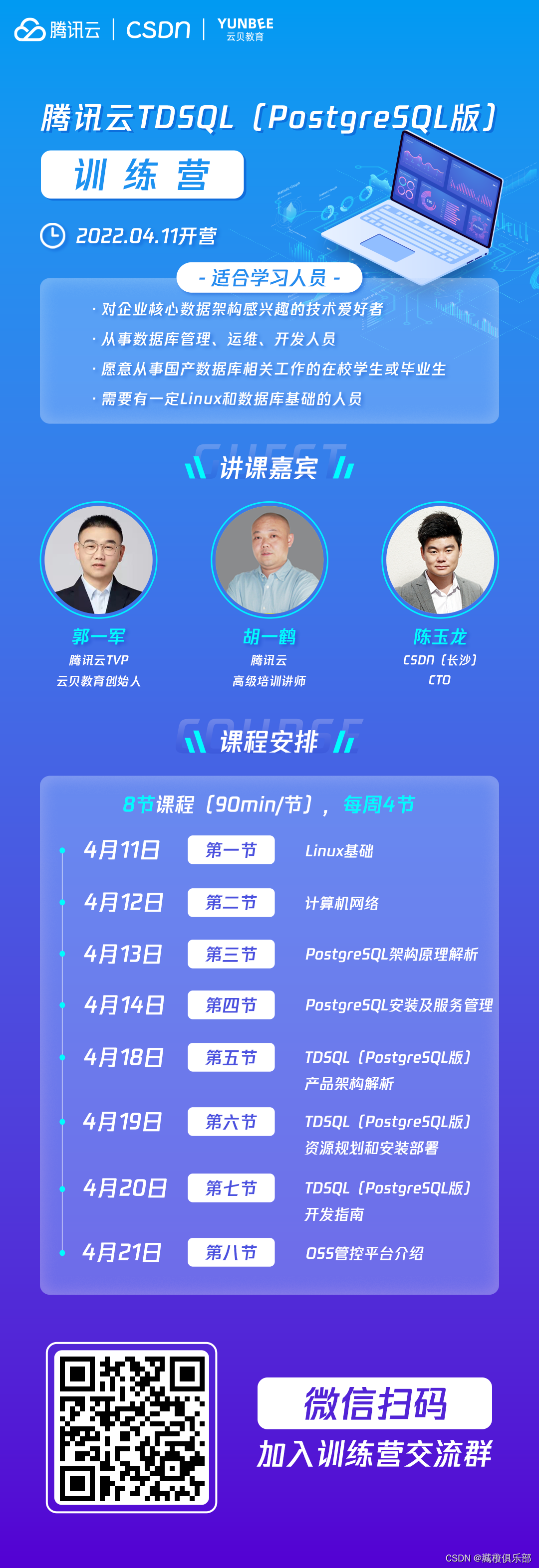 腾讯云TDSQL(PostgreSQL版)训练营汇集腾讯云数据库团队、优快云、云贝教育共同打造的第二期精品课程,旨在通过科学合理的课程安排帮助学员循序渐进掌握国产数据库知识,提升职业技能,增加就业筹码,所有社会人士均可免费报名参与。