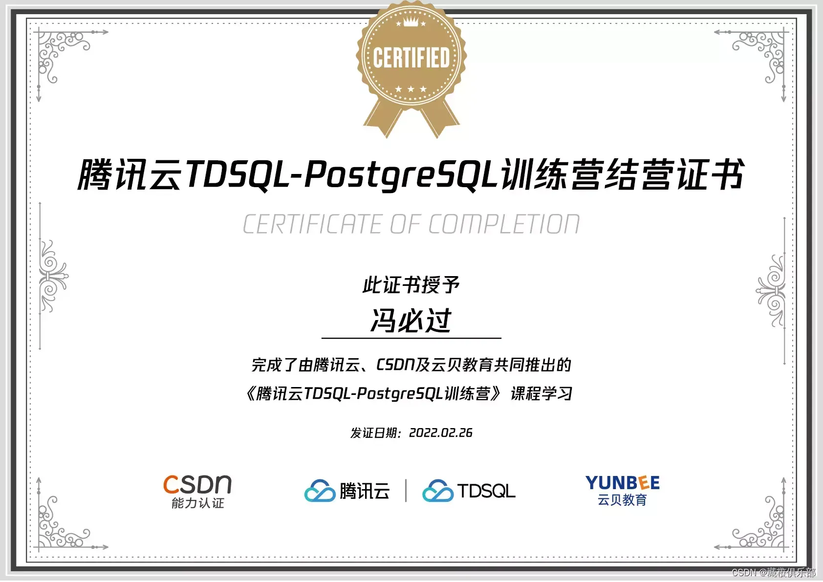 完成所有学习打卡任务并通过结营考试,可以获得由腾讯云数据库TDSQL、云贝教育、优快云联合发布的腾讯云数据库TDSQL-PostgreSQL结营证书。