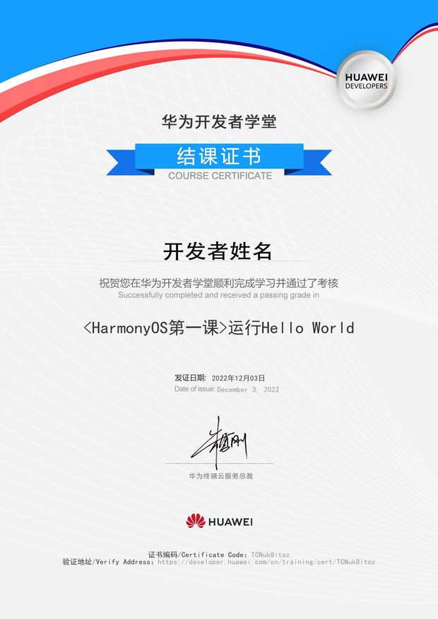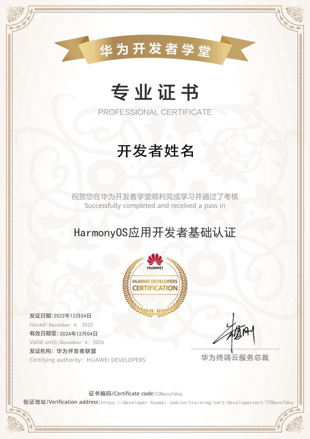 这个是结课证书,对应认证的还有一个专业证书,参加“HarmonyOS应用开发者基础认证的考试”通过后就会得到,类似如下,