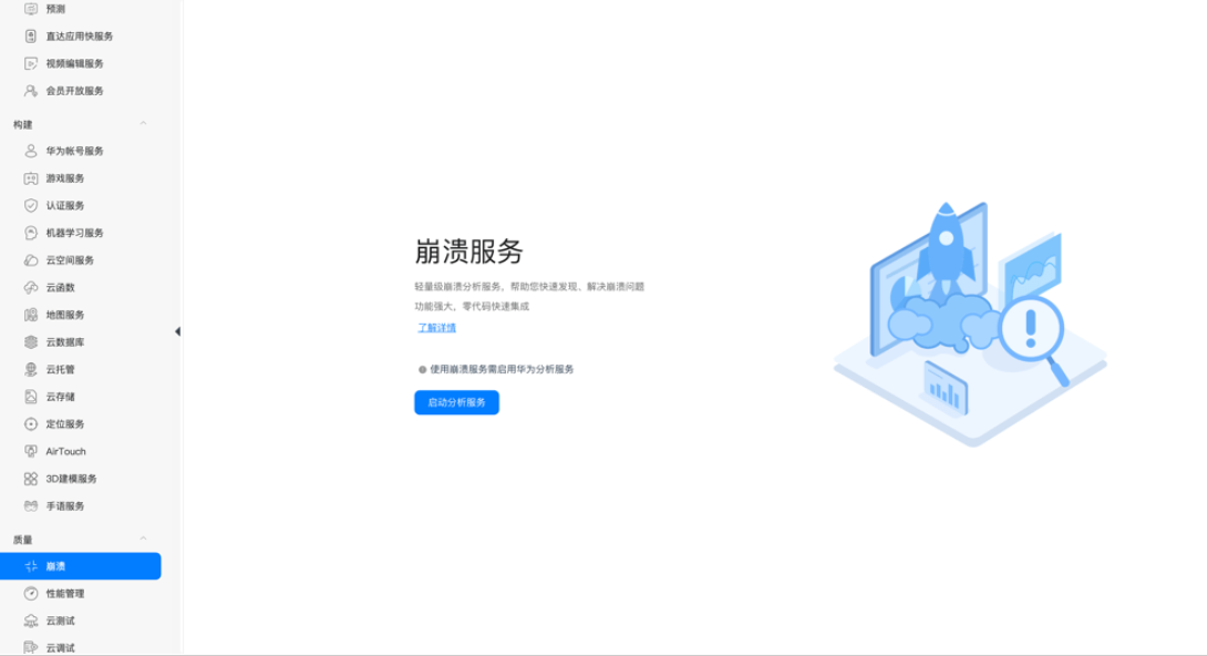 3、在导航选择“质量 > 崩溃”。如果是首次使用崩溃服务,请点击“启动分析服务”开通服务。