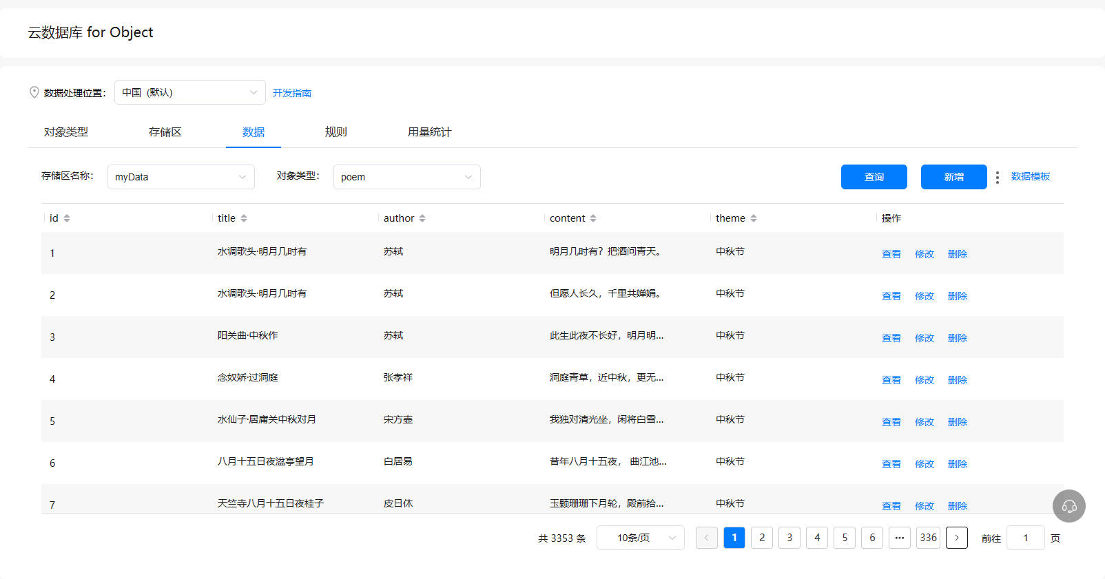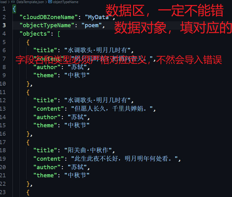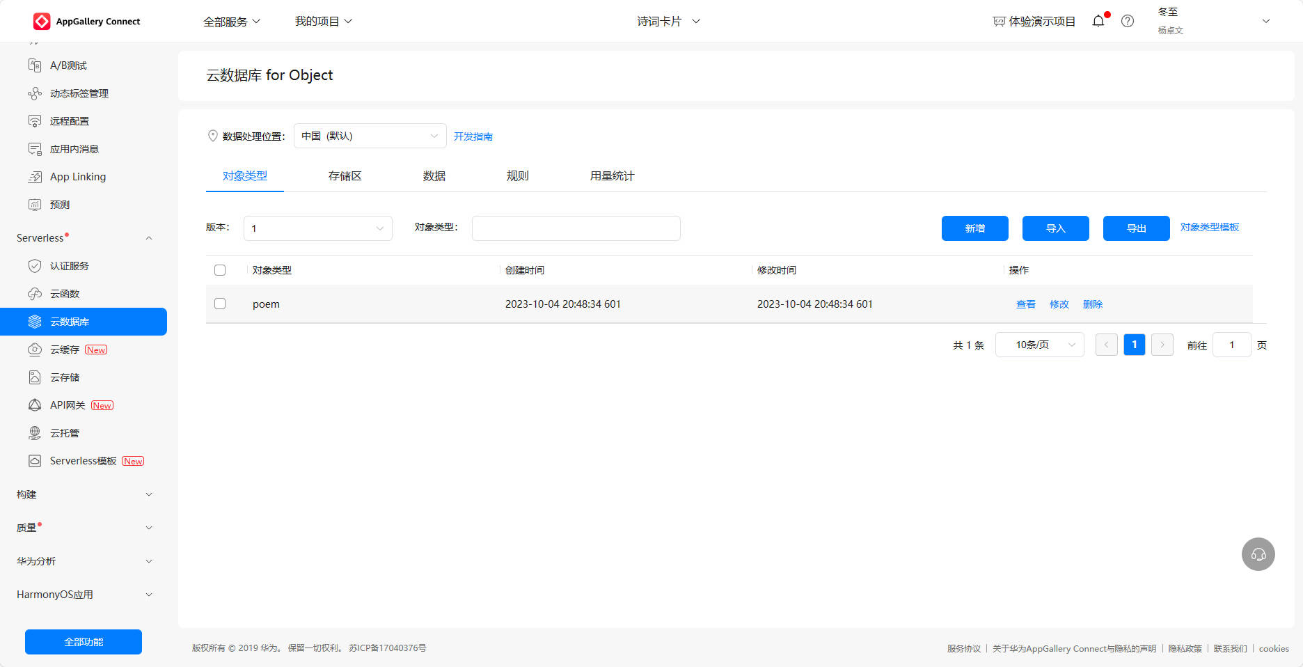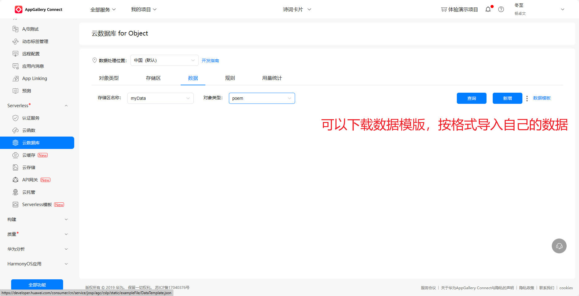 云函数get-potery的功能是根据传入的主题在云数据库中查询符合条件的数据,那么我们需要先创建数据对象,导入数据,这一部分工作可以在IDE里通过编写配置文件完成,也可以通过浏览器控制台完成,推荐后者,因为操作起来比较直观。