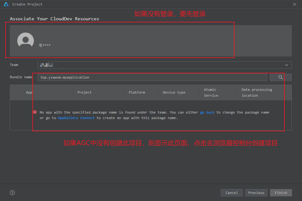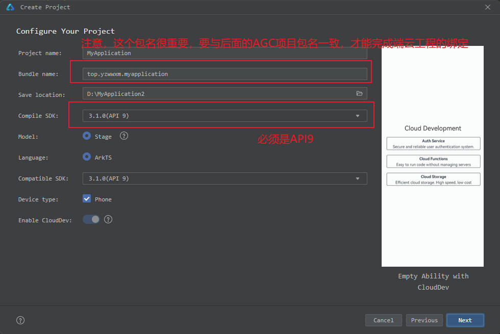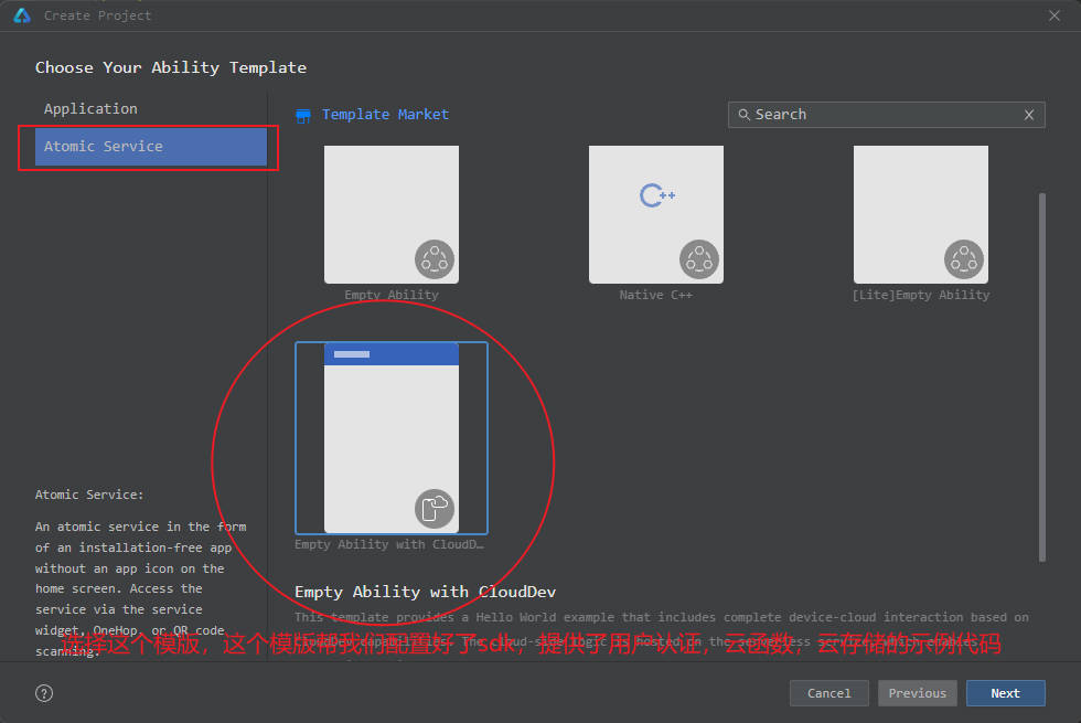 1. 在Deveco Studio中新建项目,选择元服务端云一体化模版,点击next