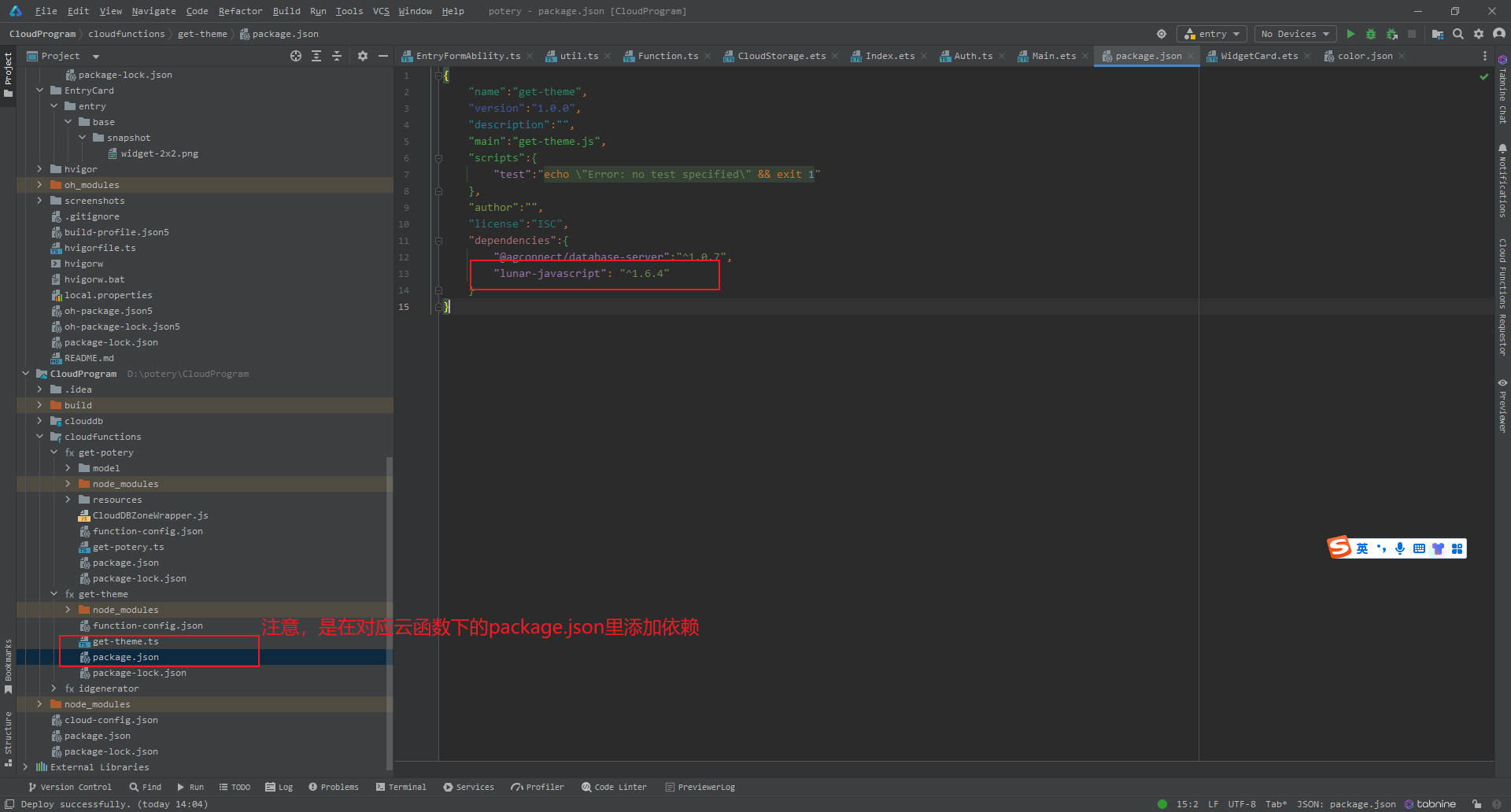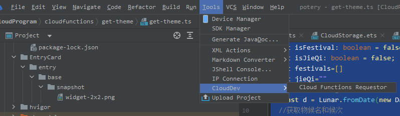 首先是获取今日的诗词主题,为了获取今天的节日和节气数据,我引入了第三方库lunar-javascript,文档链接https://6tail.cn/calendar/api.html#lunar.jieqi.html,添加方式是在云函数get-theme的目录下的package.json里添加依赖