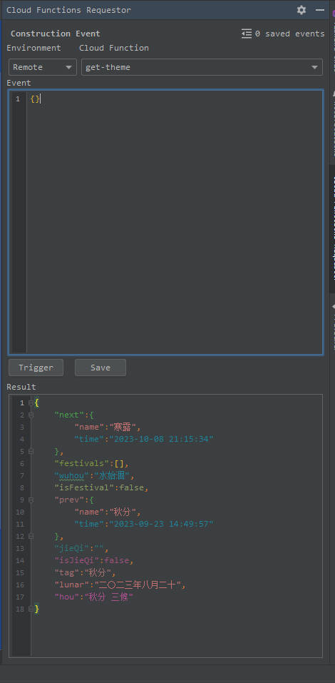 根据业务需求,我将需求拆分成了两个云函数,一个云函数的功能是根据今天的日期,查询今天是否是传统节日,或是节气,确定今天的诗词主题。另一个云函数的公司根据传入的诗词主题,查询云数据库中的诗词数据并返回。