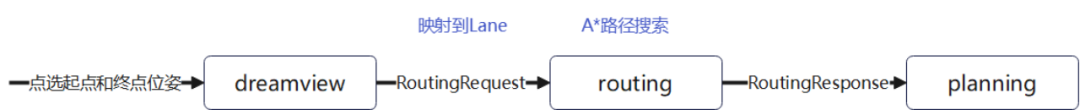 图1是Apollo收到一个导航请求时的处理流程,用户在Dreamview上通过鼠标点选和车辆当前的位置,得到起点和终点的位姿,经过在地图上映射,得到RoutingRequest信息,其中包含了起点和终点在最近车道上的对应点。