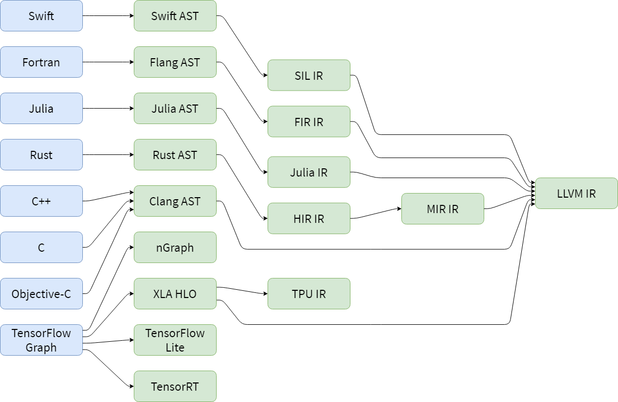 MLIR 旨在成为一种在统一的基础架构中支持多种不同需求的混合中间表示,例如: