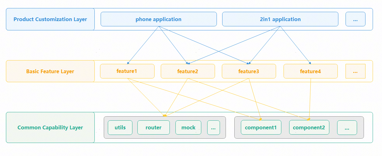 - 公共能力层:存放公共能力,包括公共UI组件、数据管理、外部交互和工具库等共享功能。
