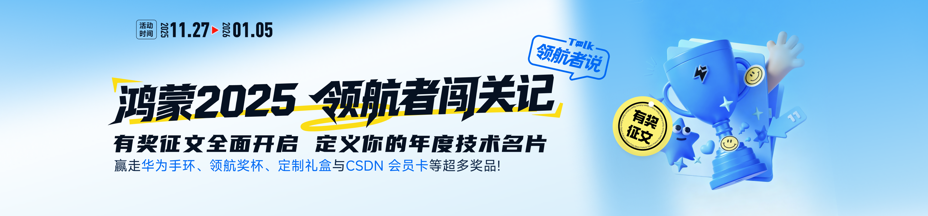 “鸿蒙 2025・领航者闯关记”有奖征文活动正式开启,这不仅是一场比赛,更是属于每一位鸿蒙开发者的年度高光舞台与职业赋能平台。在这里,您可以将过去一年的技术沉淀、成长轨迹与生态实践,淬炼为掷地有声的干货分享。我们致力于让每一次用心的技术输出,都能兑换为实实在在的职业竞争力、平台资源扶持与社区影响力,真正实现 “让技术分享, 变成看得见的收获”。