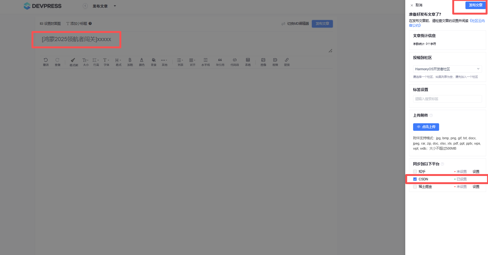 - step1:标题带 [鸿蒙2025领航者闯关记] 在【HarmonyOS开发者社区】发布文章并同步至优快云,具体操作方式如下图: