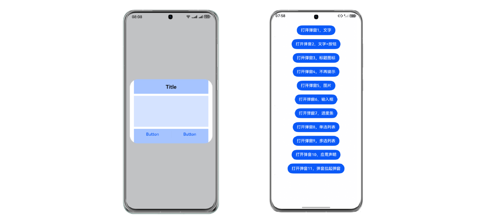 | 通用组件 | 用于在屏幕底部弹出一个包含与当前情景相关的多个选项的模态面板,支持单行/多行显示,支持展示图片、状态、标题等多项自定义内容。 | |