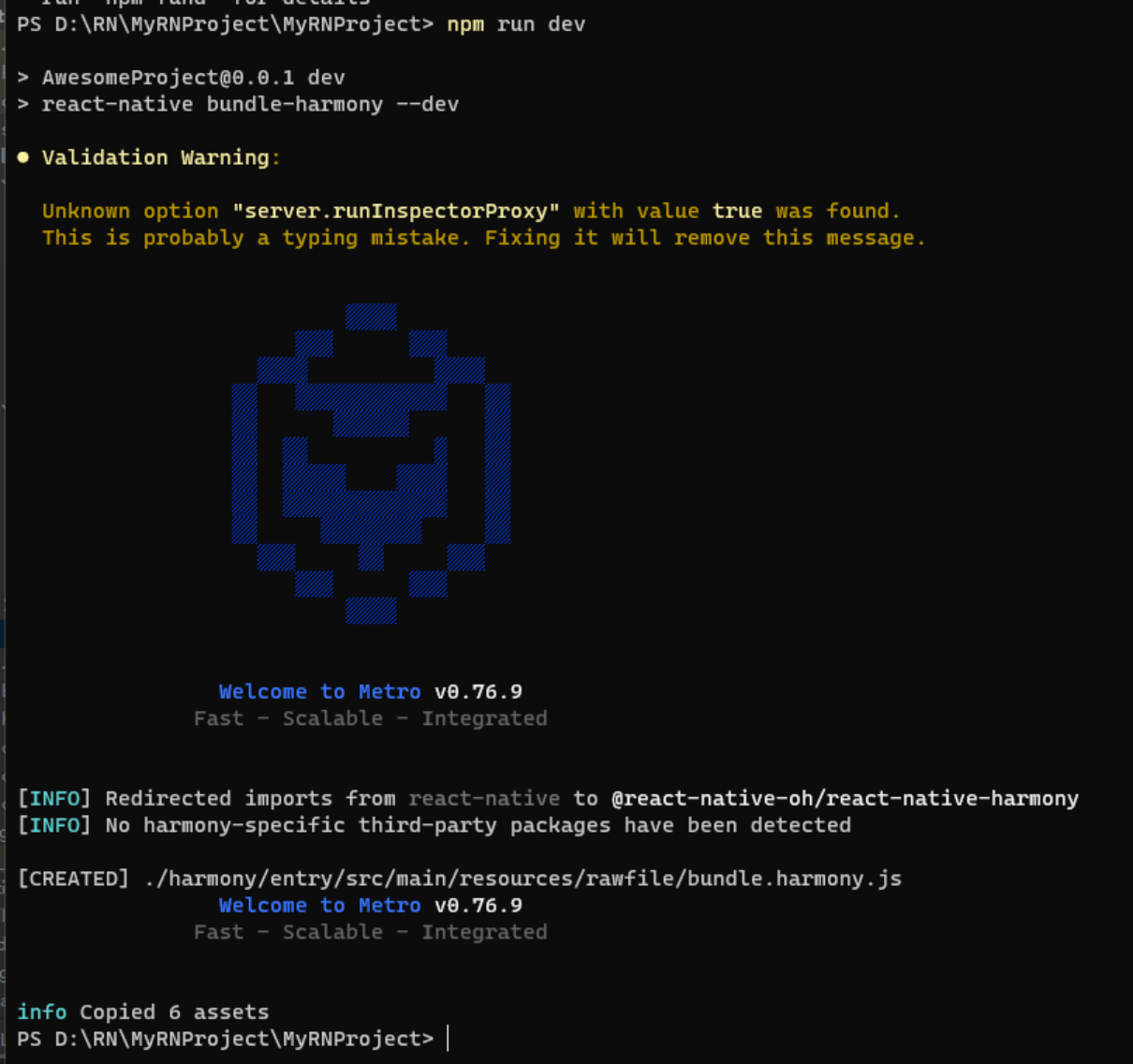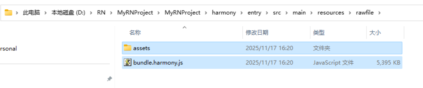 运行成功后,会在 AwesomeProject/harmony/entry/src/main/resources/rawfile 目录下生成 bundle.harmony.js 和 assets 文件夹,assets 用来存放图片(如果 bundle 中不涉及本地图片,则没有 assets 文件夹):