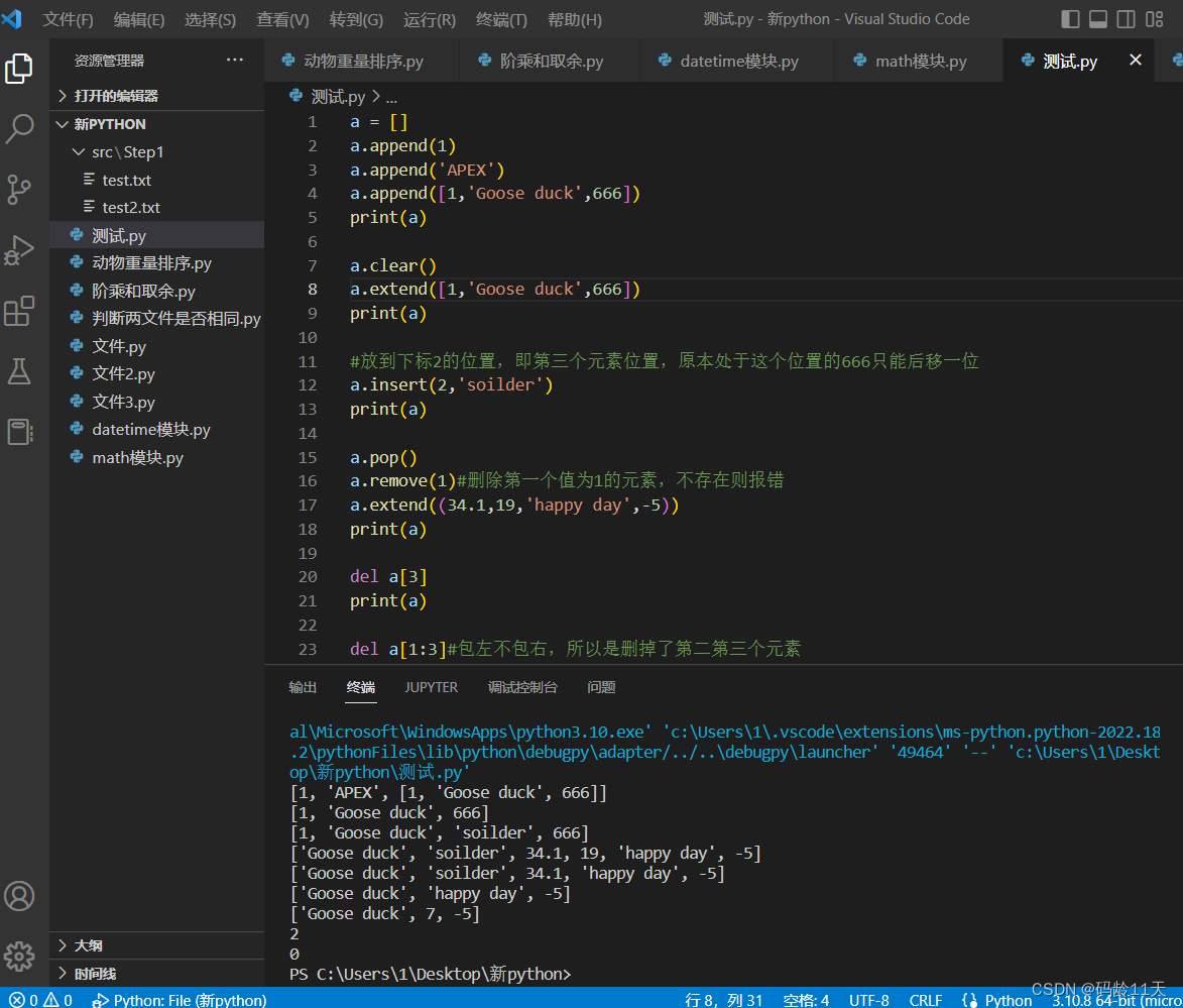 按元素本身的值删除,注意1,只会删除第一个和指定值相同的元素,2,若元素不存在,会报错ValueError