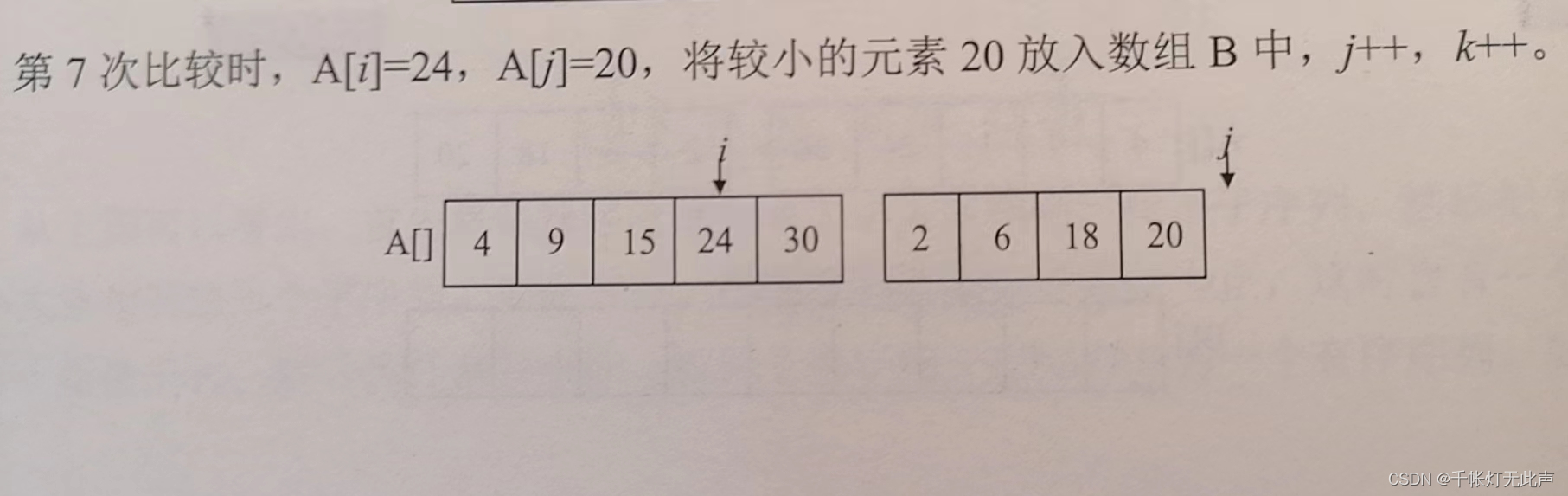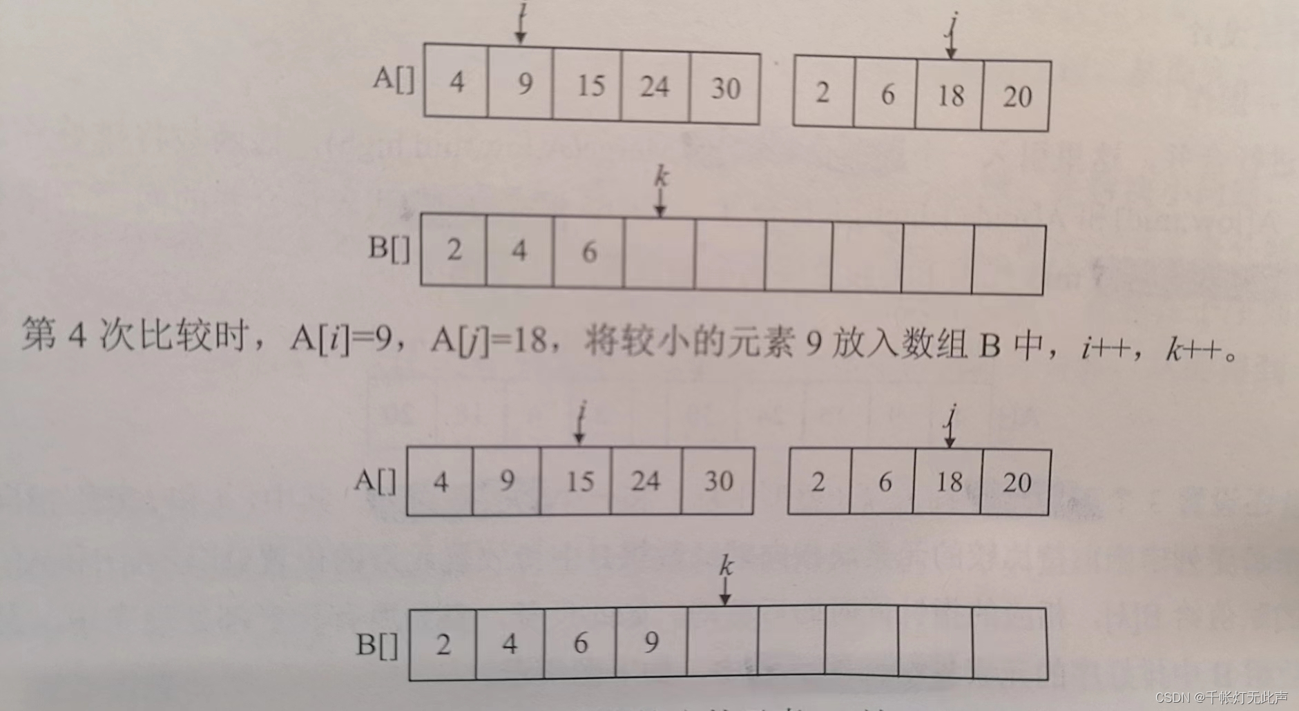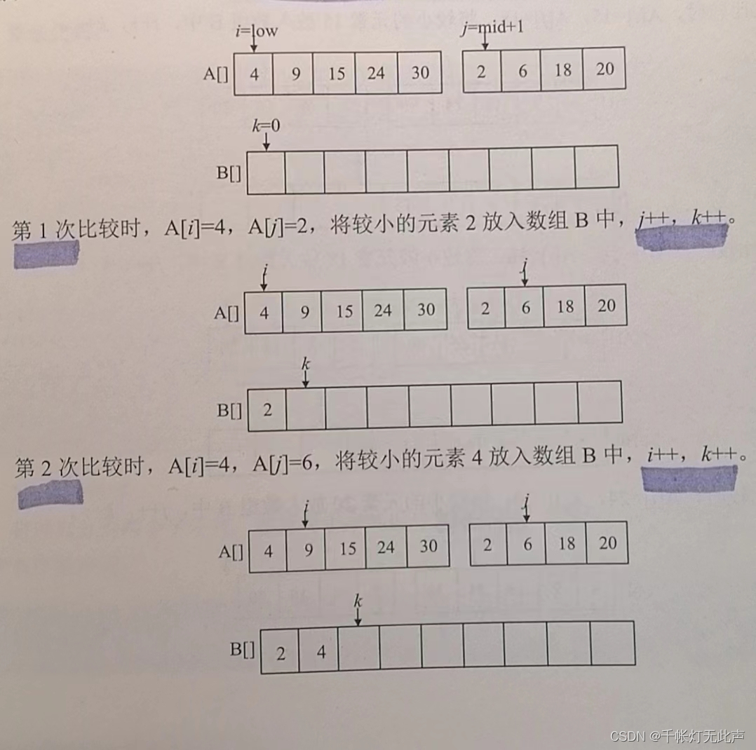 i, j指向两个子序列中,当前待比较的元素,k指向辅助数组B中待放置元素的位置