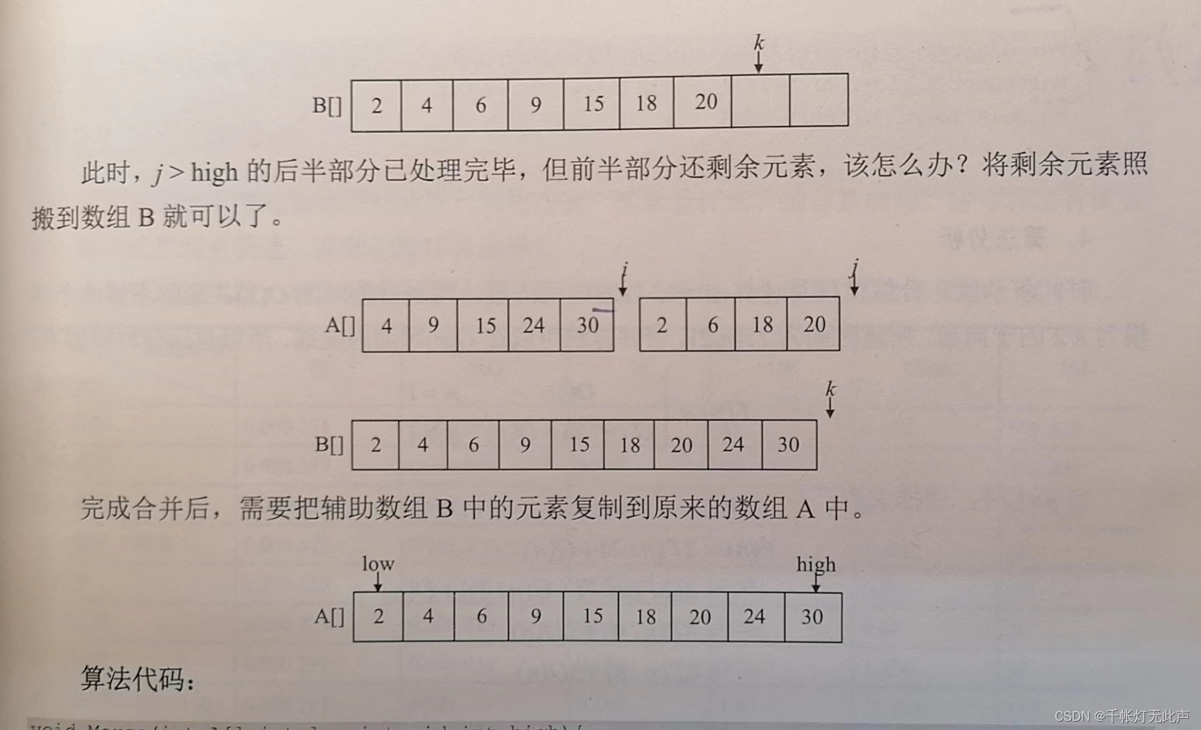 此外,还有3个工作指针i, j, k(整型下标)和辅助数组B