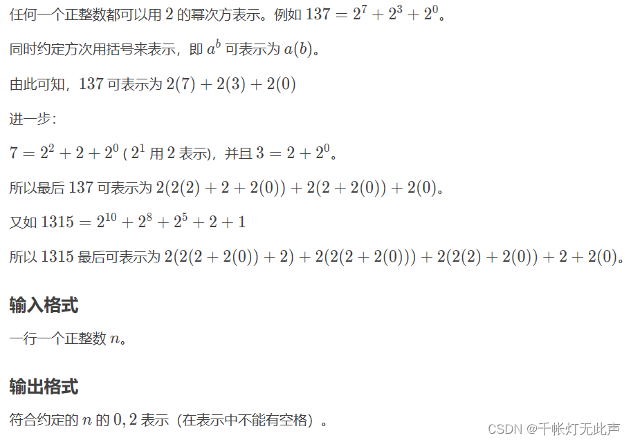 P1010 [NOIP1998 普及组] 幂次方 - 洛谷 | 计算机科学教育新生态 (luogu.com.cn)