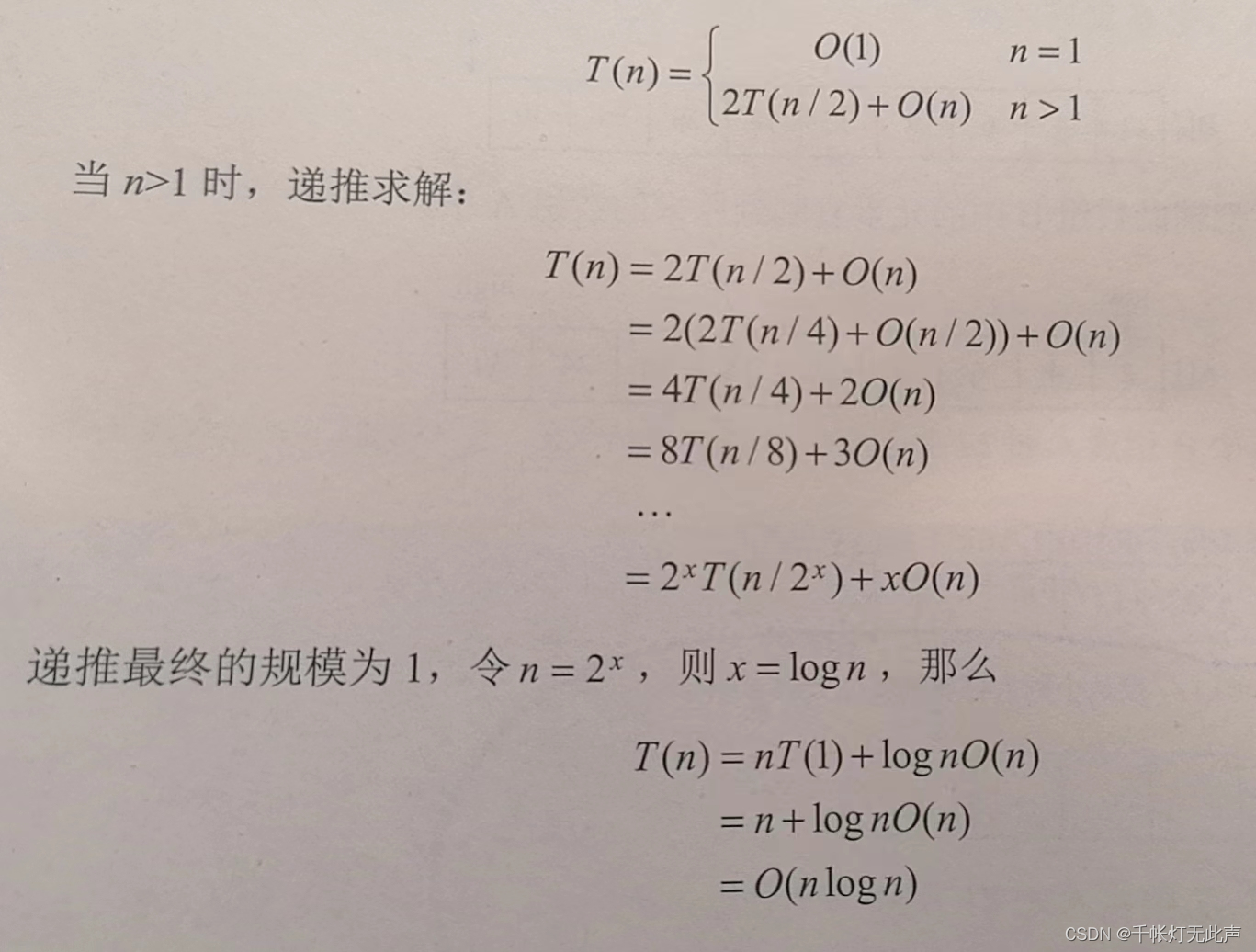 递归:递归求解2个规模为n/2的子问题,需要时间2T(n/2)