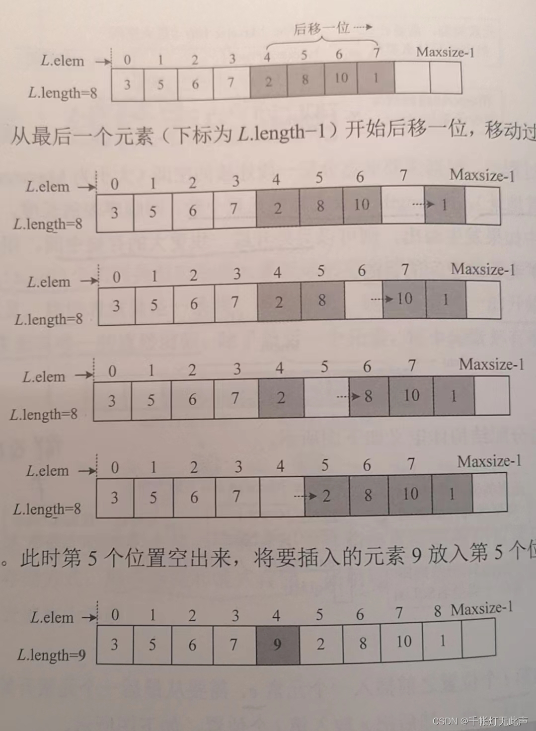 位置 i 插入元素e,需要将第L.length至第 i 个元素,依次后移一个位置,空出第 i 个位置