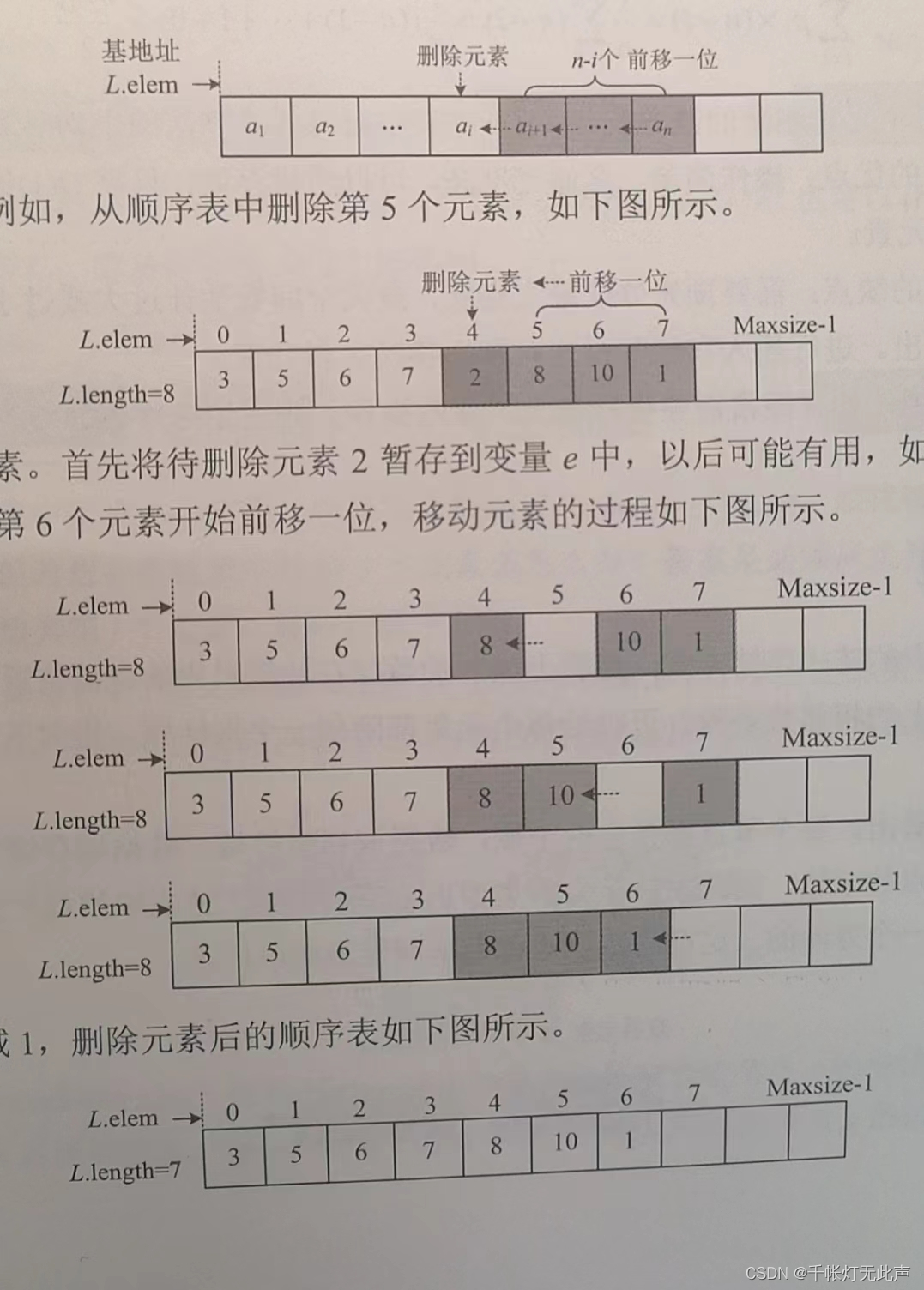 删除第 i 个元素,需要将该元素暂存到变量e中(后续可能用上),然后从第 i + 1个元素开始前移...直到把第 n 个元素也前移 1 位