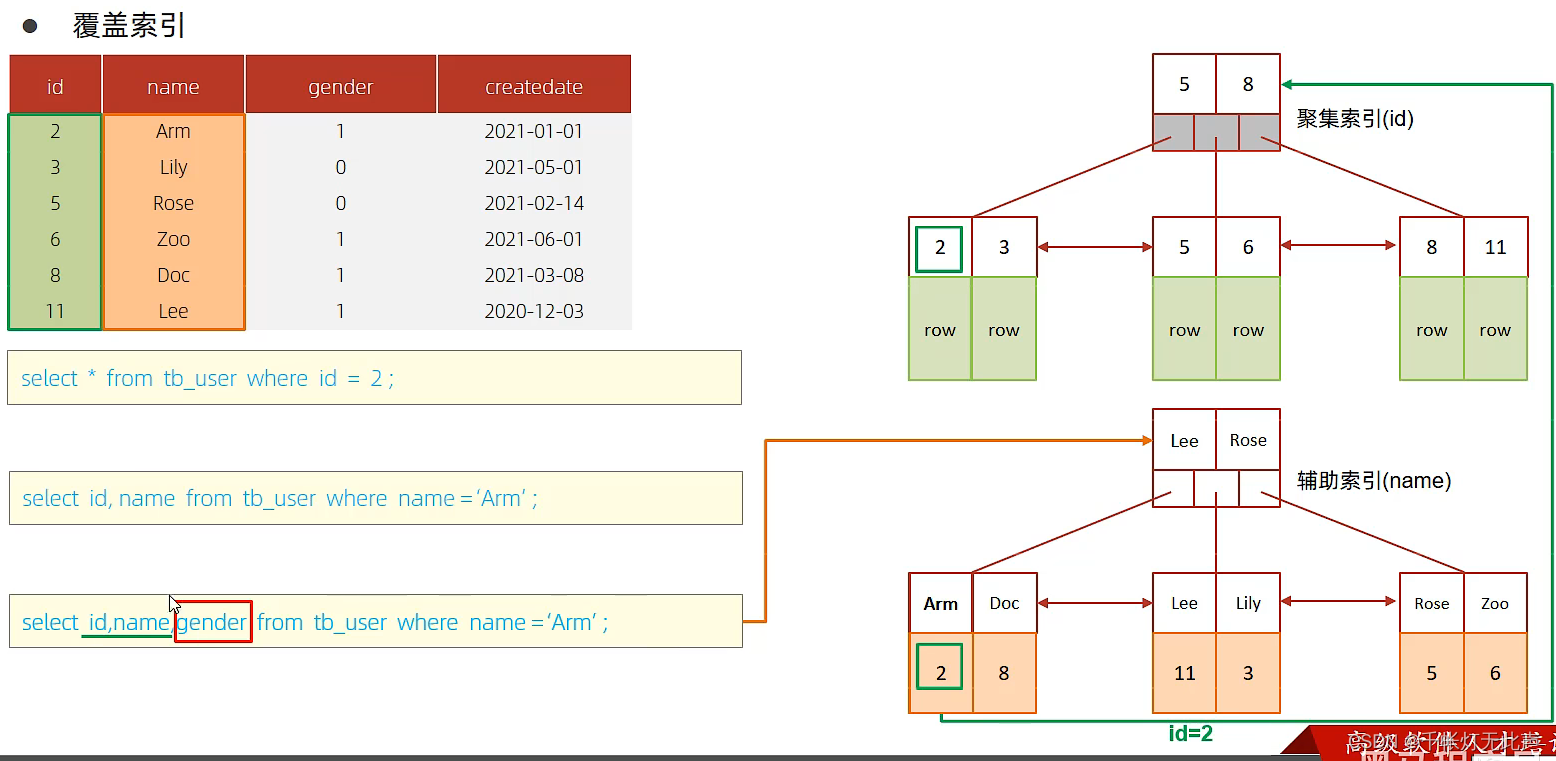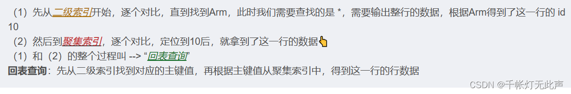 但是(1)中name字段,不在这个二级索引中,还要到id的聚集索引中查找