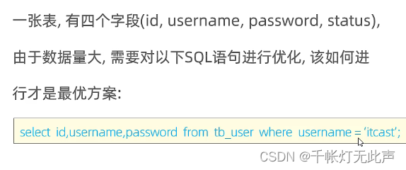 答:根据username, password两个字段,建立联合索引(二级索引),而二级索引叶子下挂的就是id,即覆盖索引,不需要回表查询
