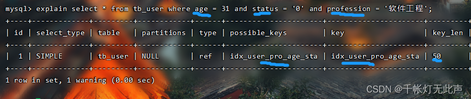 索引长度一样,说明(1)没有走 status 的索引,因为不满足最左前缀法则,中间跳过了 age 的索引,所以索引部分失效