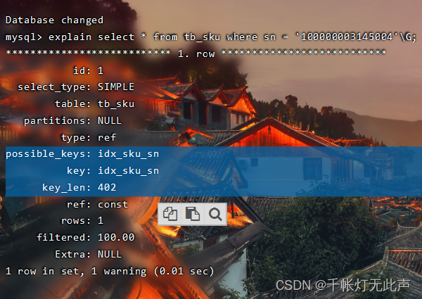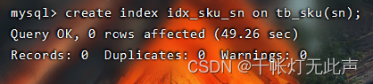 执行show index from tb_sku; 后,发现没有 sn 的索引,所以查询1条记录的时间相当于查询 * 的时间,下面我们需要创建 sn 的索引👇