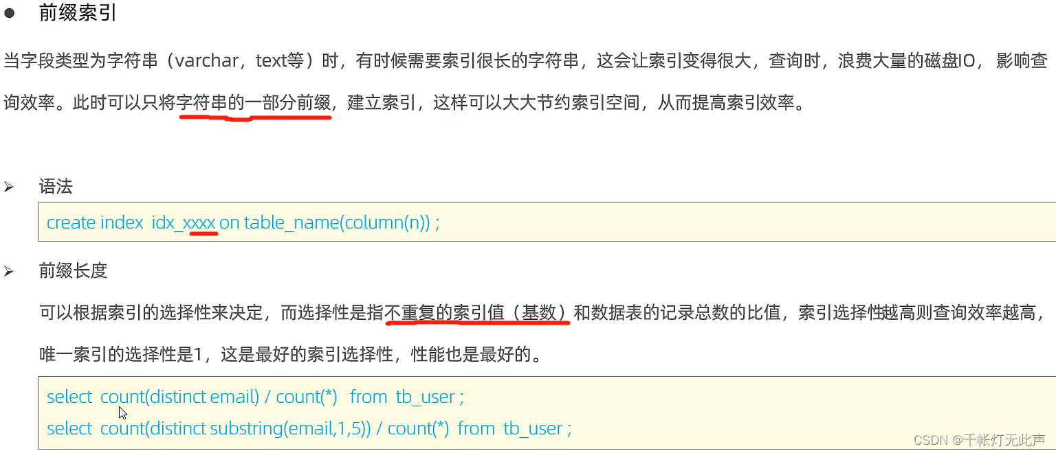 大文本或长字符串,采取前缀索引,降低索引体积,提高查询效率,避免对磁盘IO的浪费